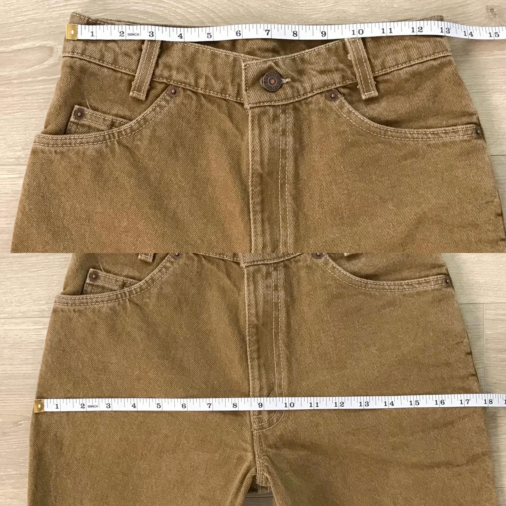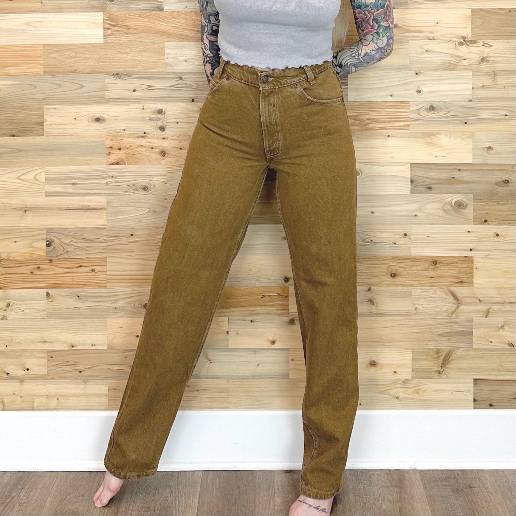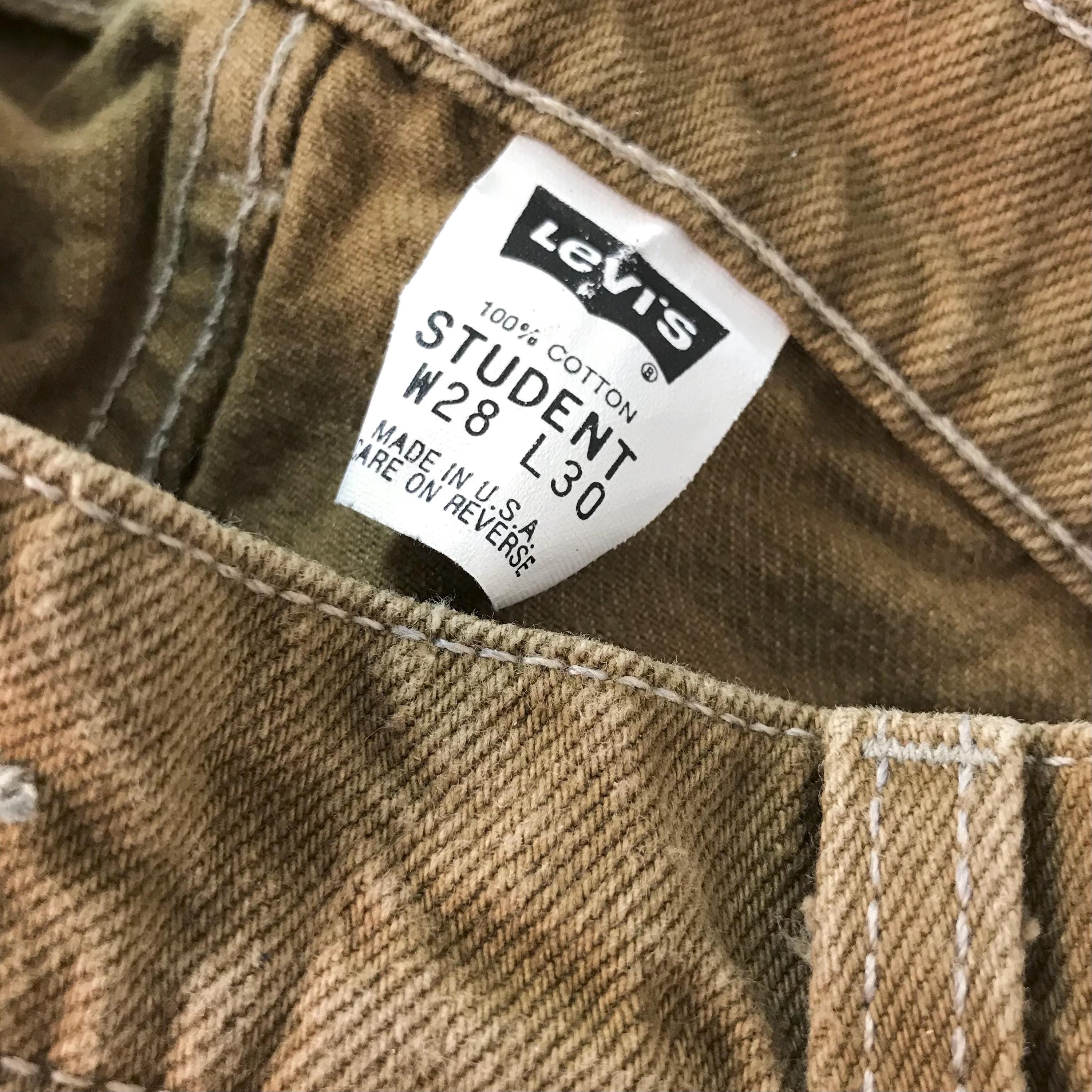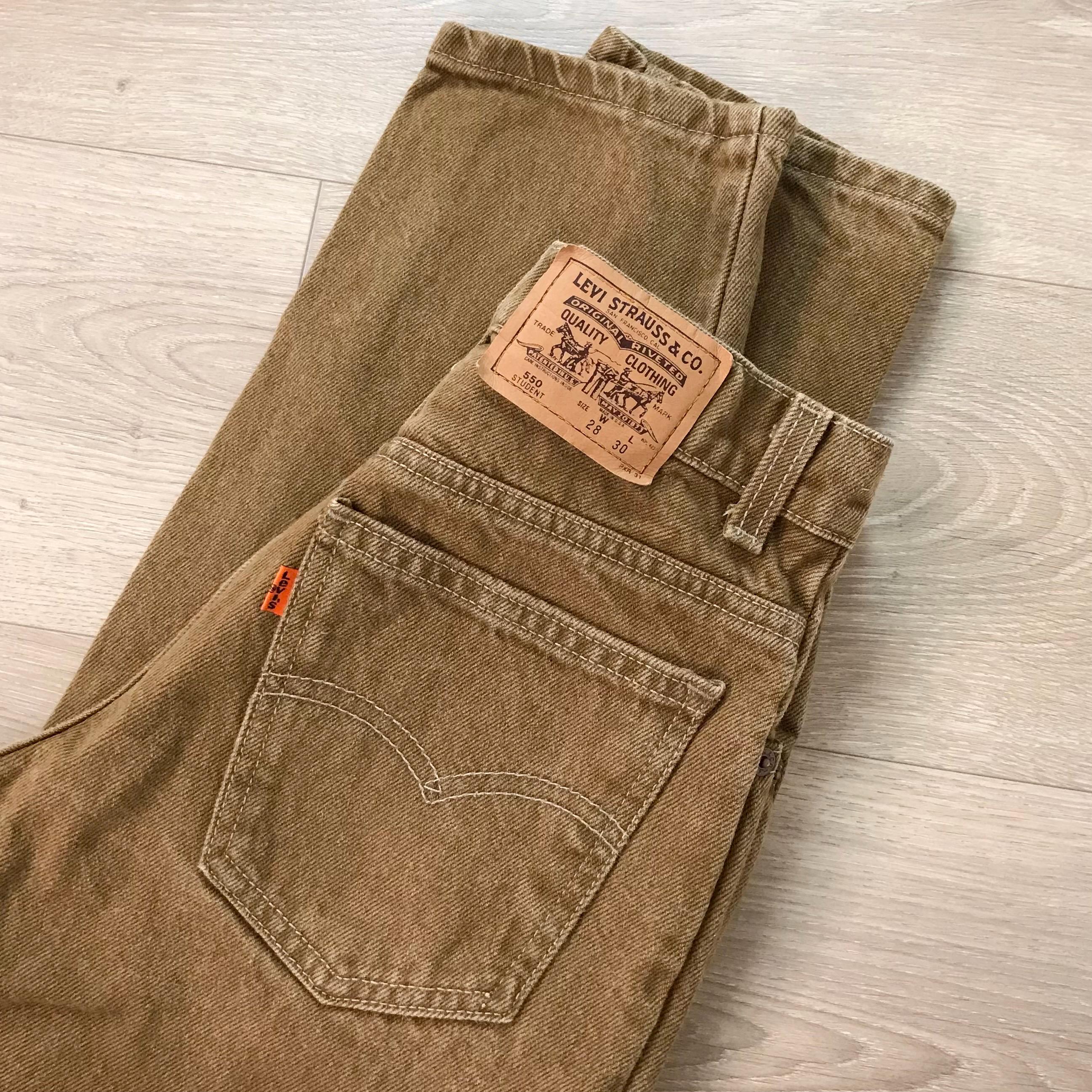 Details: Student fit Levi's typically have a slimmer fit through the hip and bum / Denim is a mustard-y dijon brown color / Jeans were deadstock brand new with original tags, but I've since removed the tags to give them a good soak (they were in storage for many years!)