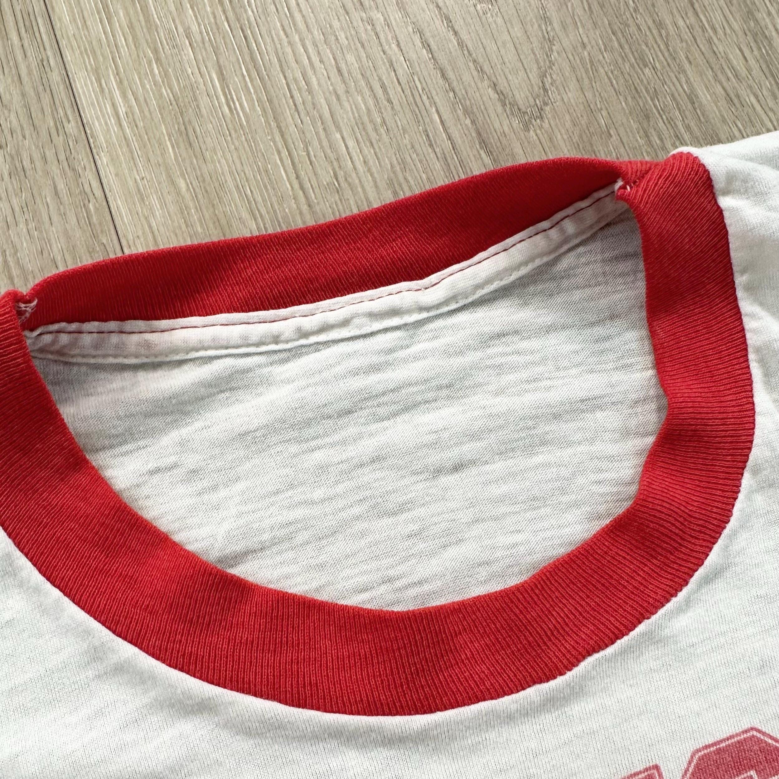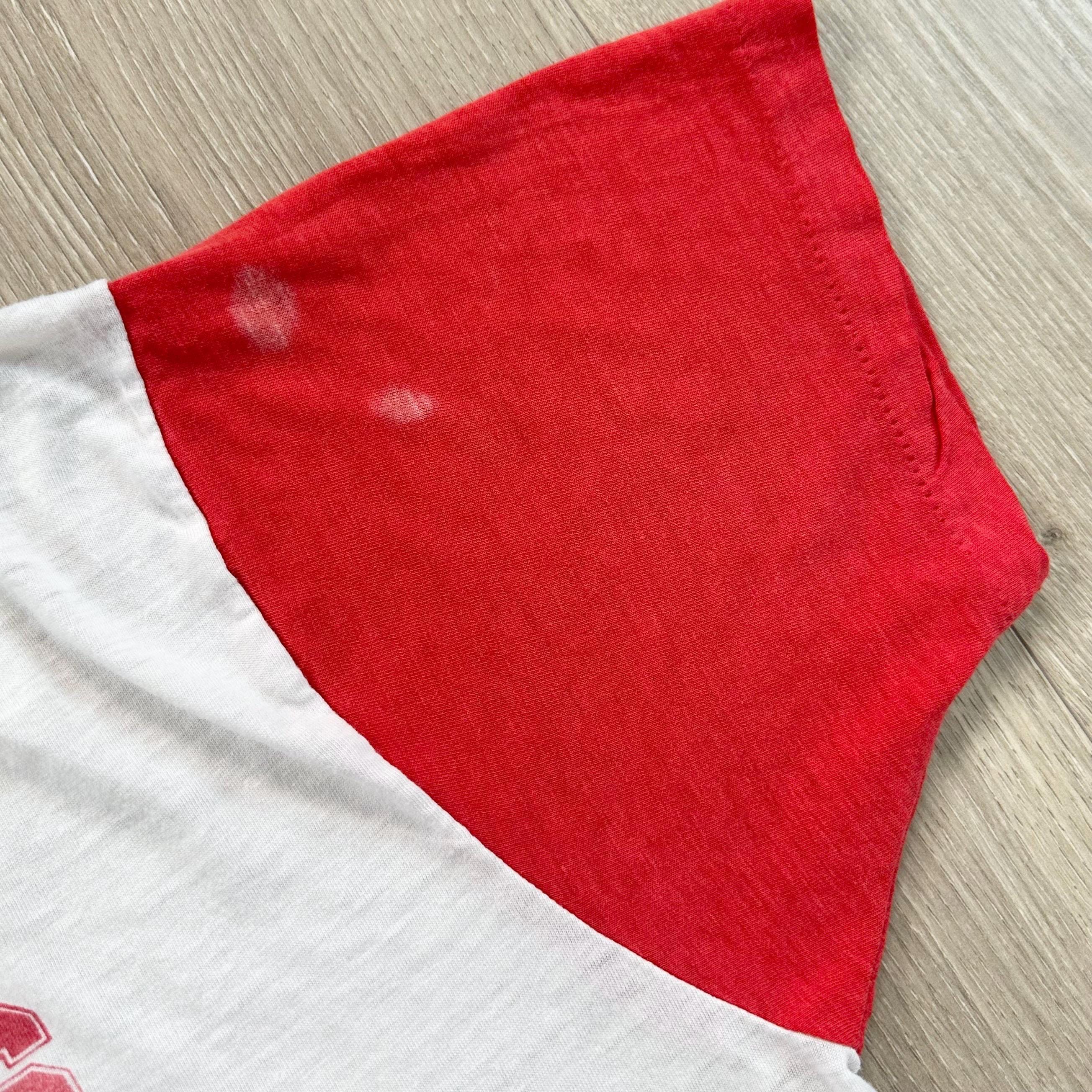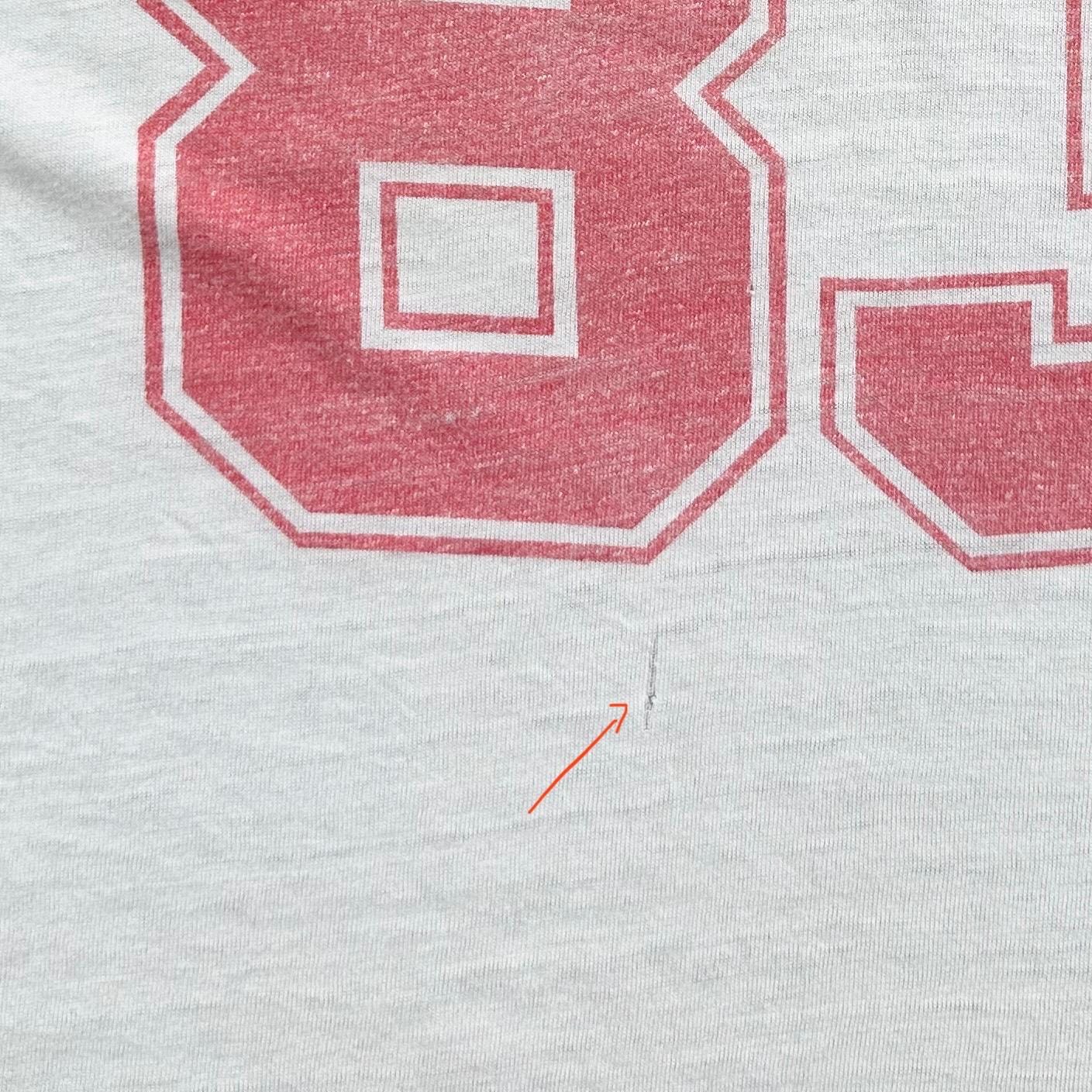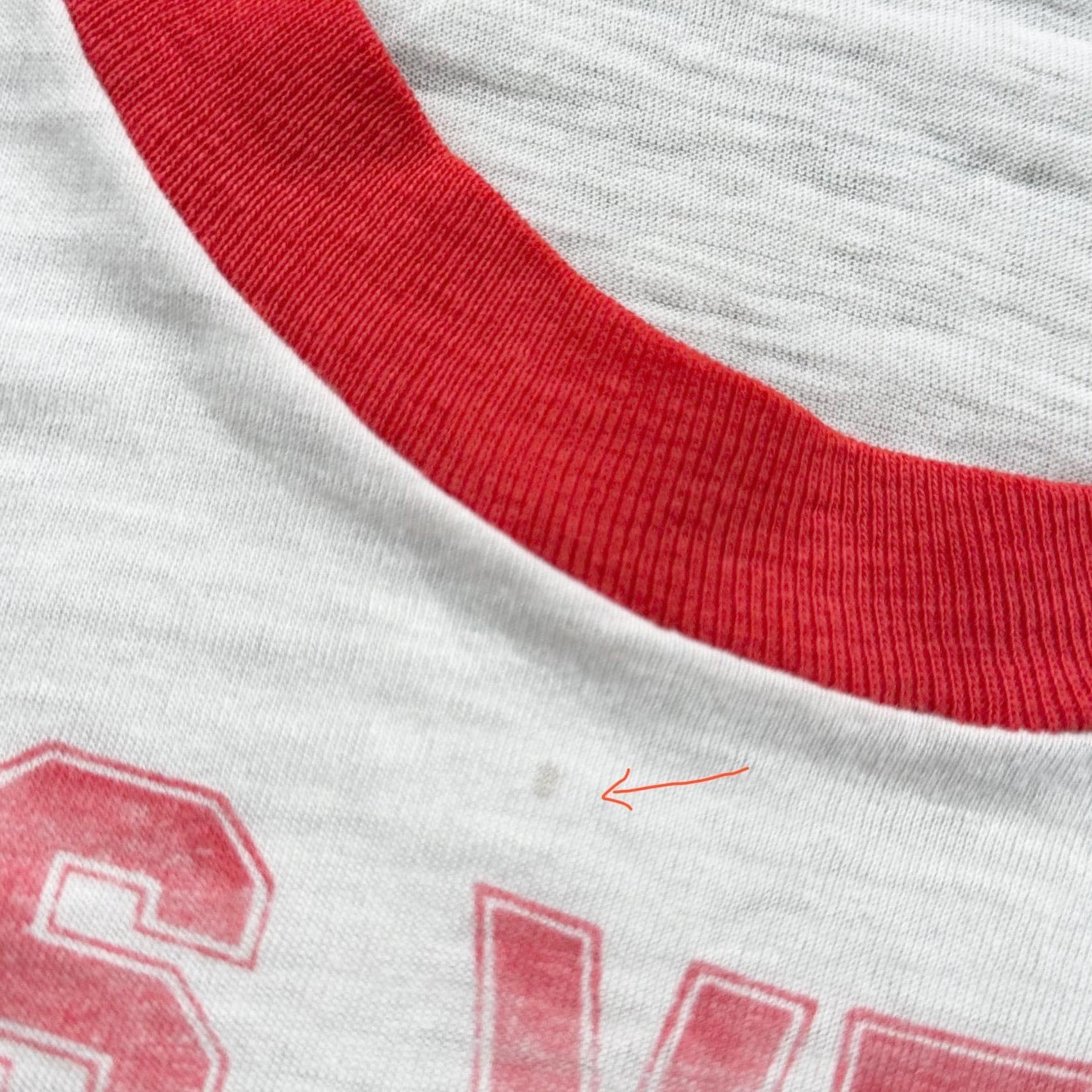 *Condition / Notable wear or flaws: Very worn and soft with small bleach marks on sleeve, tiny mark near collar and threadbare spot near bottom (see all photos - really great true vintage character!)