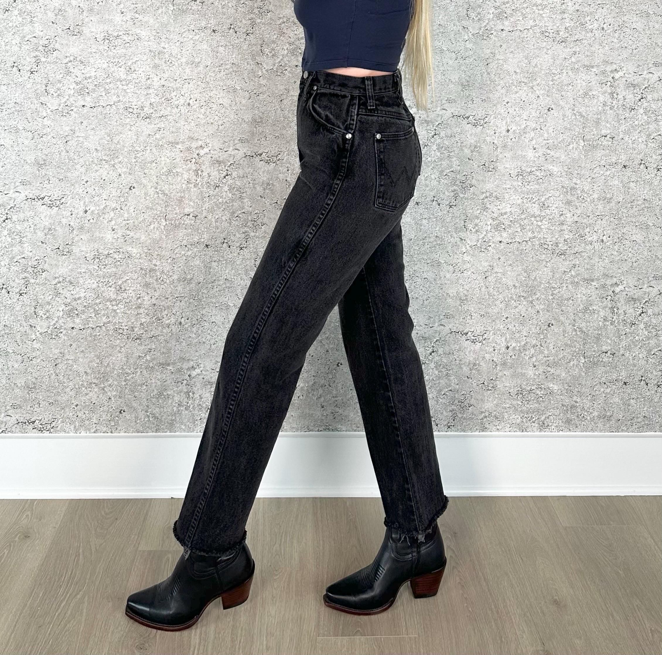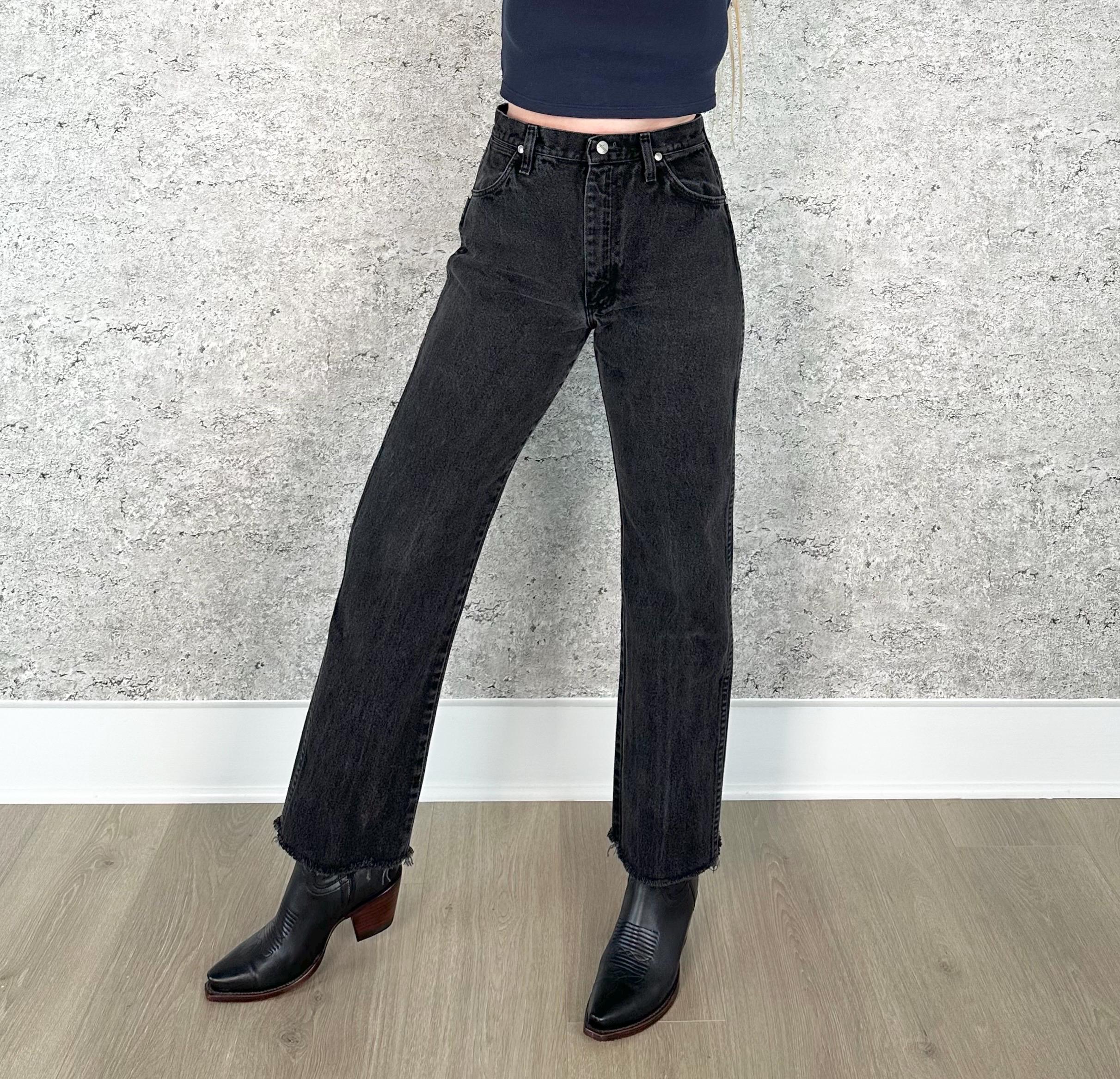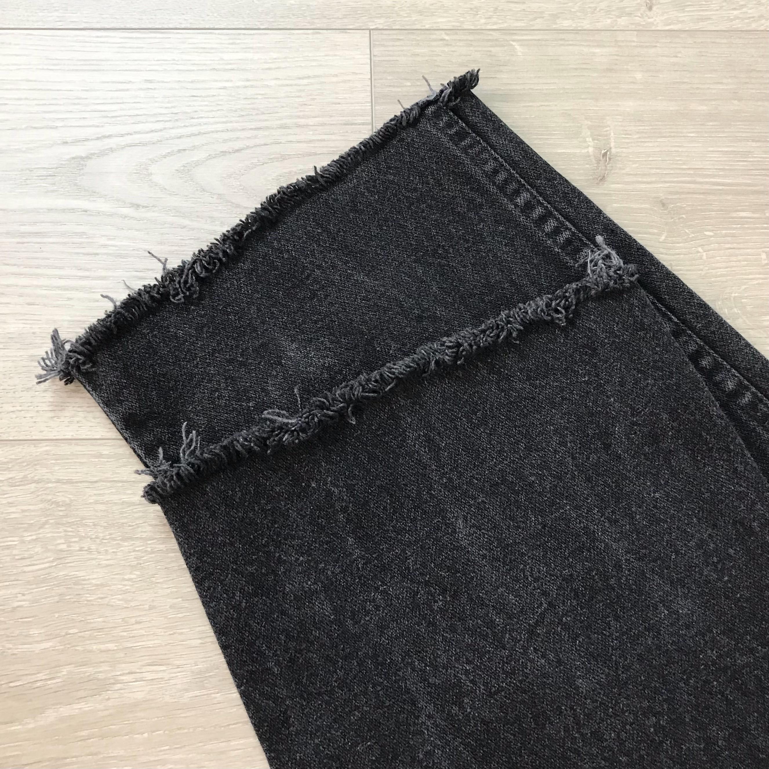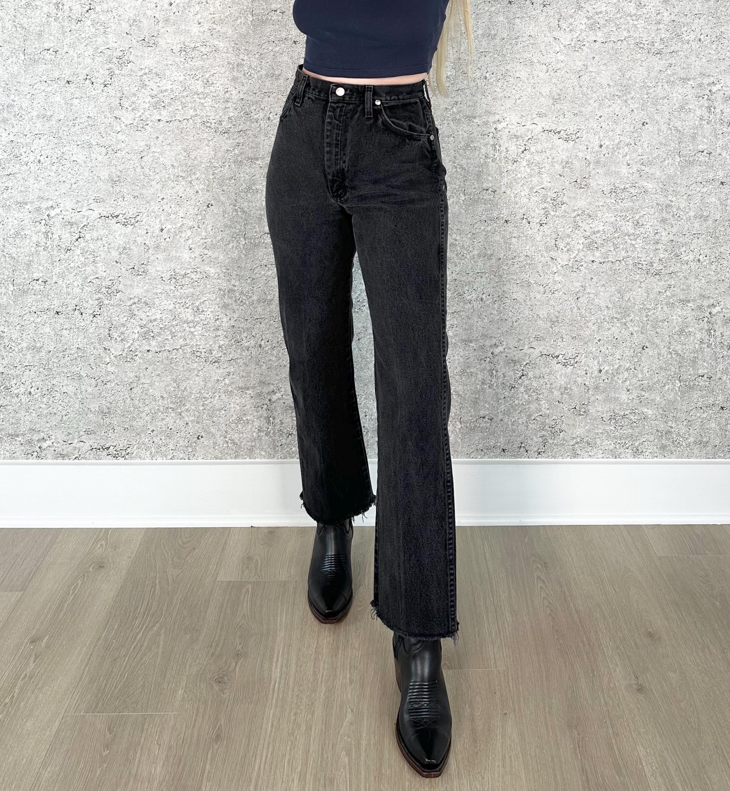 Details: Cropped raw hem at ankle / Denim is a subtly faded black