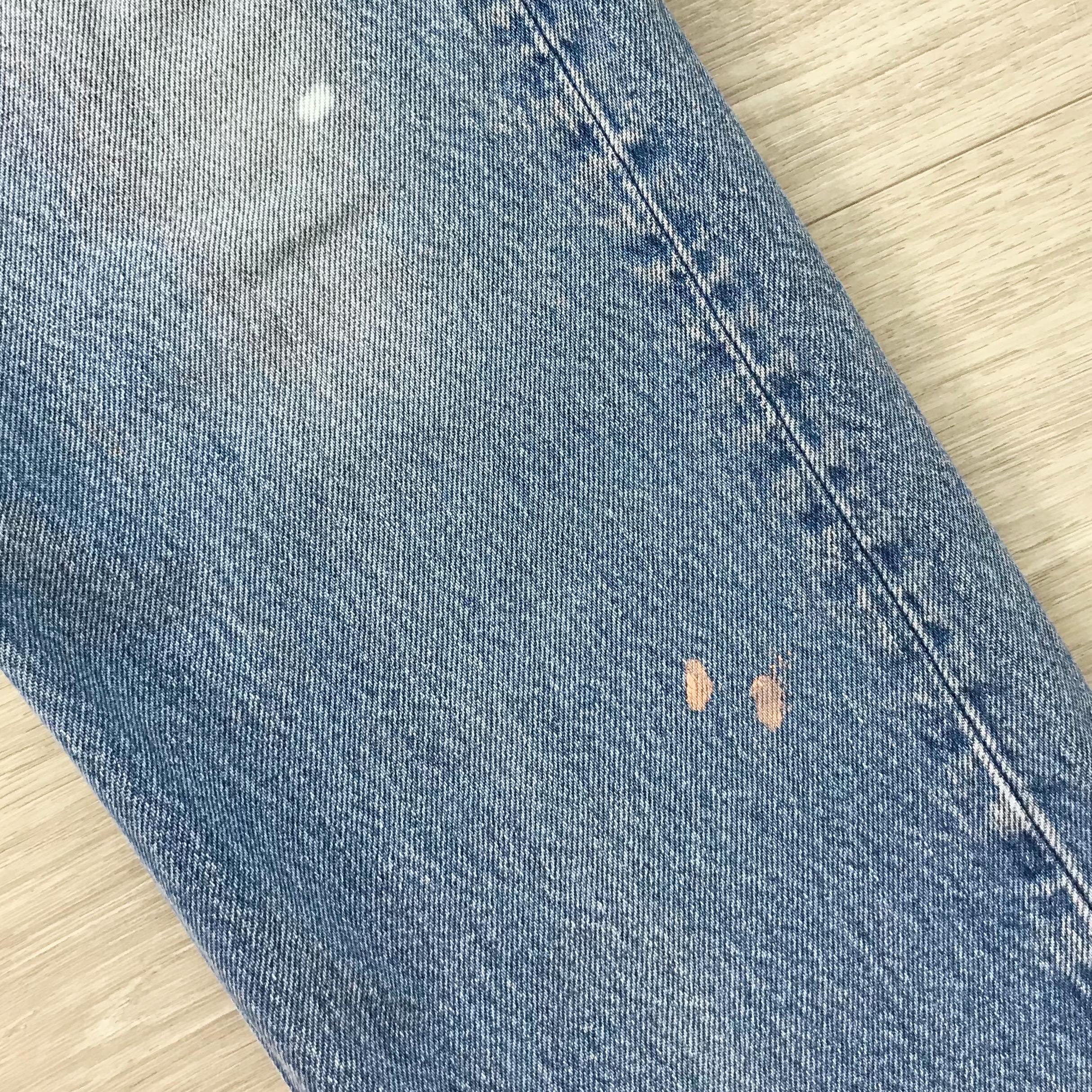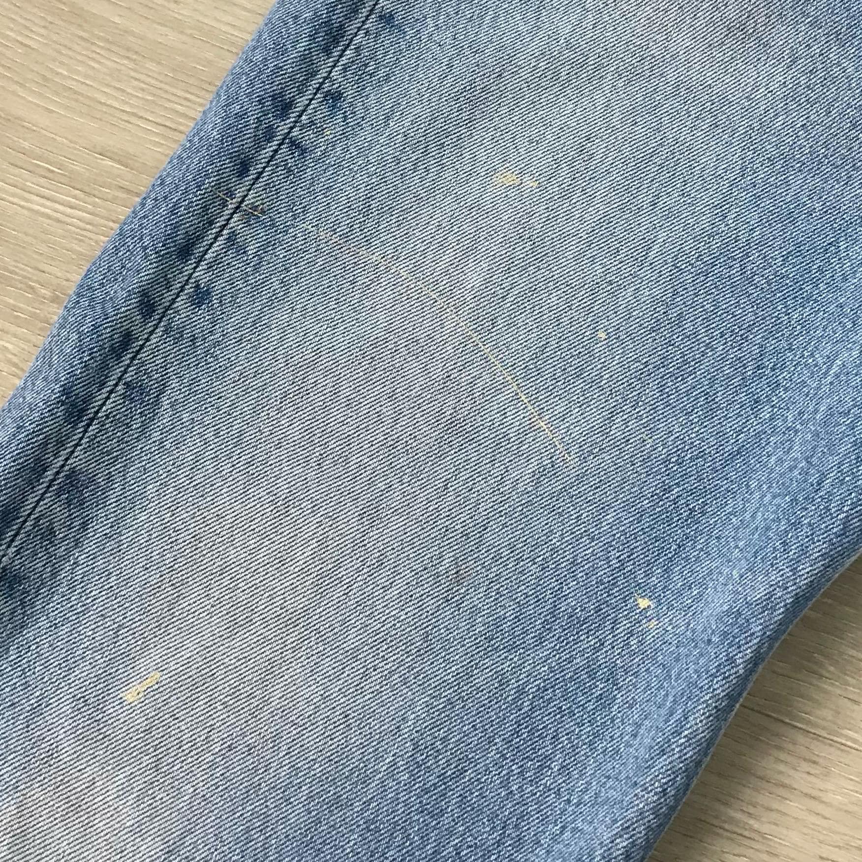 Details: Denim has paint splatter throughout (mostly light yellow and peach)